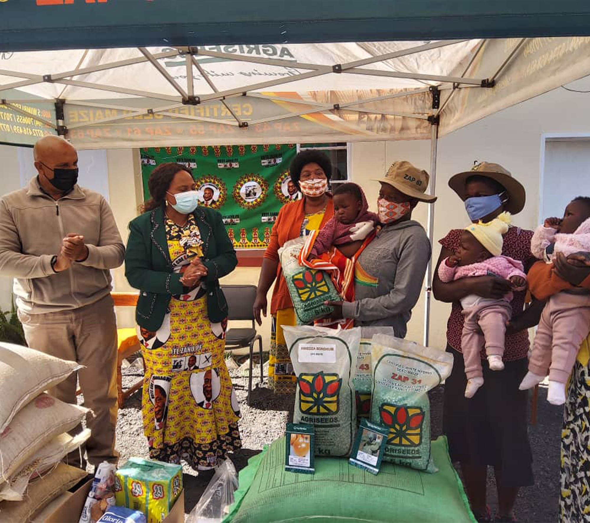 Mother of tripplets, Olinda Maphosa receives a donation from Agriseeds represented by Mr Ivan Craig (Sales Director), at the handover ceremony graced by the Minister of Information and Publicity, Honourable Minister Monica Mutsvangwa in Mutare recently, May 2021.